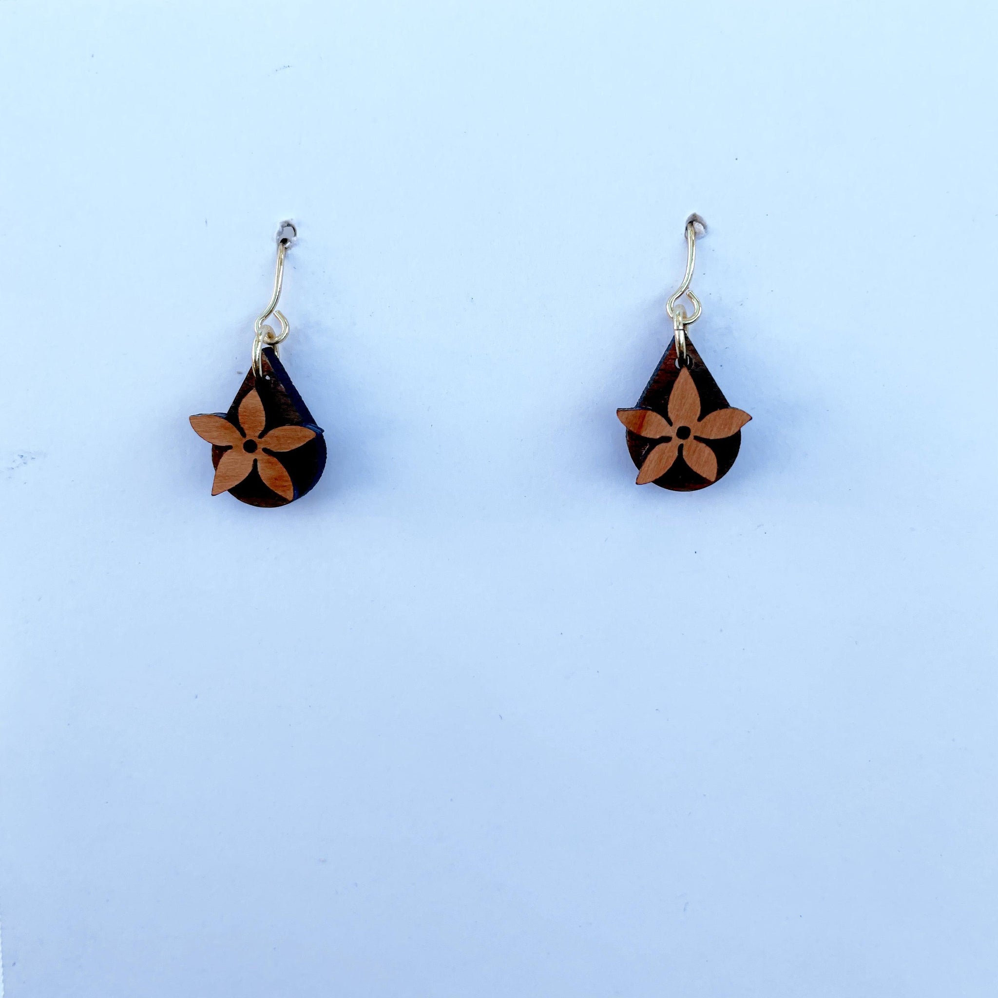 Hardwood drops with hardwood pua (flower) * Extremely Lightwieght * Laser Cut Ash, Cherry, and Walnut Hardwoods * Gold or Silver Plated Earwires *Each Pair May Vary With Wood Grain and Color