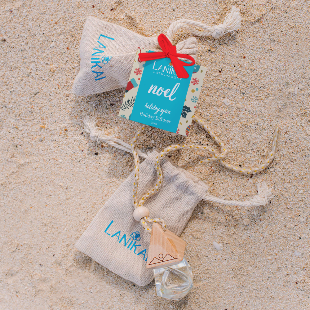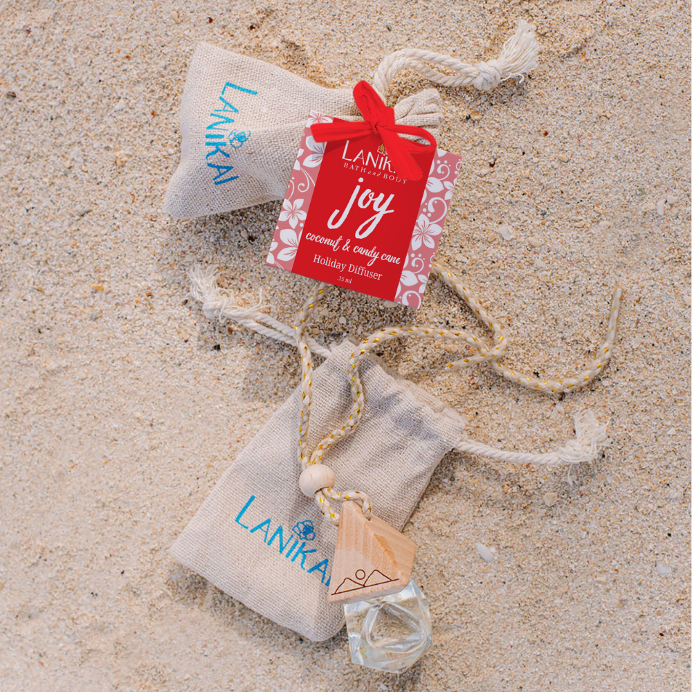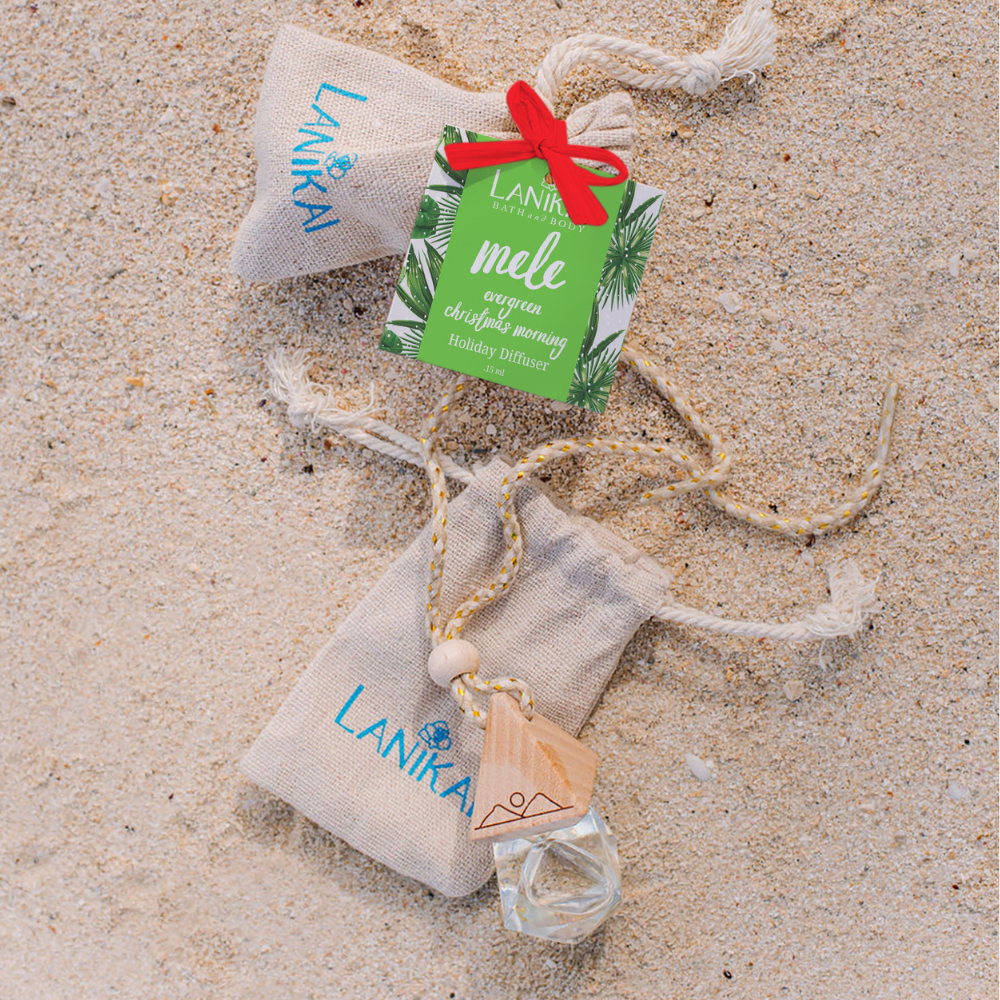 Paradise on the Go with our tropical car diffusers! Place our twin islands diffuser inside vehicle {closet, locker, or anywhere in the home!} and enjoy a little bit of paradise. Each car diffuser is made with a natural jute cord, an engraved twin islands wooden top, and a prismatic glass container. Comes cozied in a Lanikai jute bag.